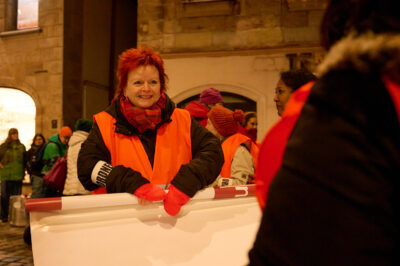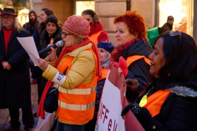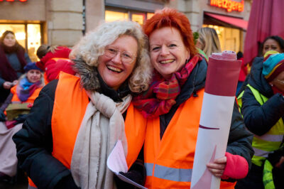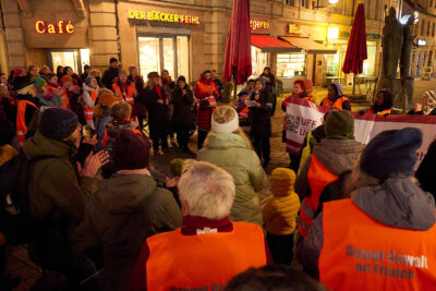 Bei der Auftaktkundgebung am Dreifrauenbrunnen (Dreiherrenbrunnen) sprachen neben Vertreterinnen der Veranstalter auch zwei Frauen, die selbst von Gewalt betroffen waren. Kerstin hätte sich nie hätte vorstellen können, dass ihr so etwas zustößt. Mit viel Kraft hat sie sich aus dieser Situation befreit. Sie sagte: „Gemeinschaft ist, was mich stark macht, und die mich Worte finden lässt für das Unaussprechliche.“ Wichtige Worte, denn nur wenn Betroffene darüber reden, entsteht Aufmerksamkeit. Und nur wenn Menschen hinhören und hinfühlen, kann Betroffenen geholfen werden.