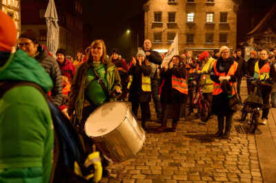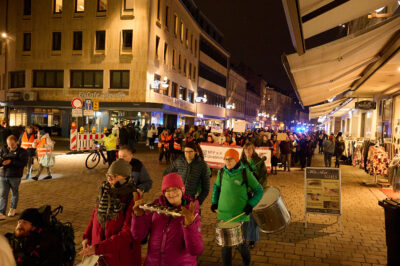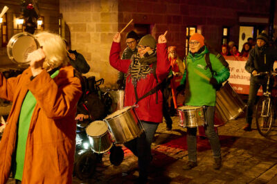 Anschließend zogen die Demonstrierenden durch Fürth – begleitet von den Sambistas aus der Musikschule. Die lauten, rythmischen Trommeln waren eine ganz hervorragende und trotz des schweren Themas beschwingende Vorhut der vielen Frauen, Männer und Kinder.